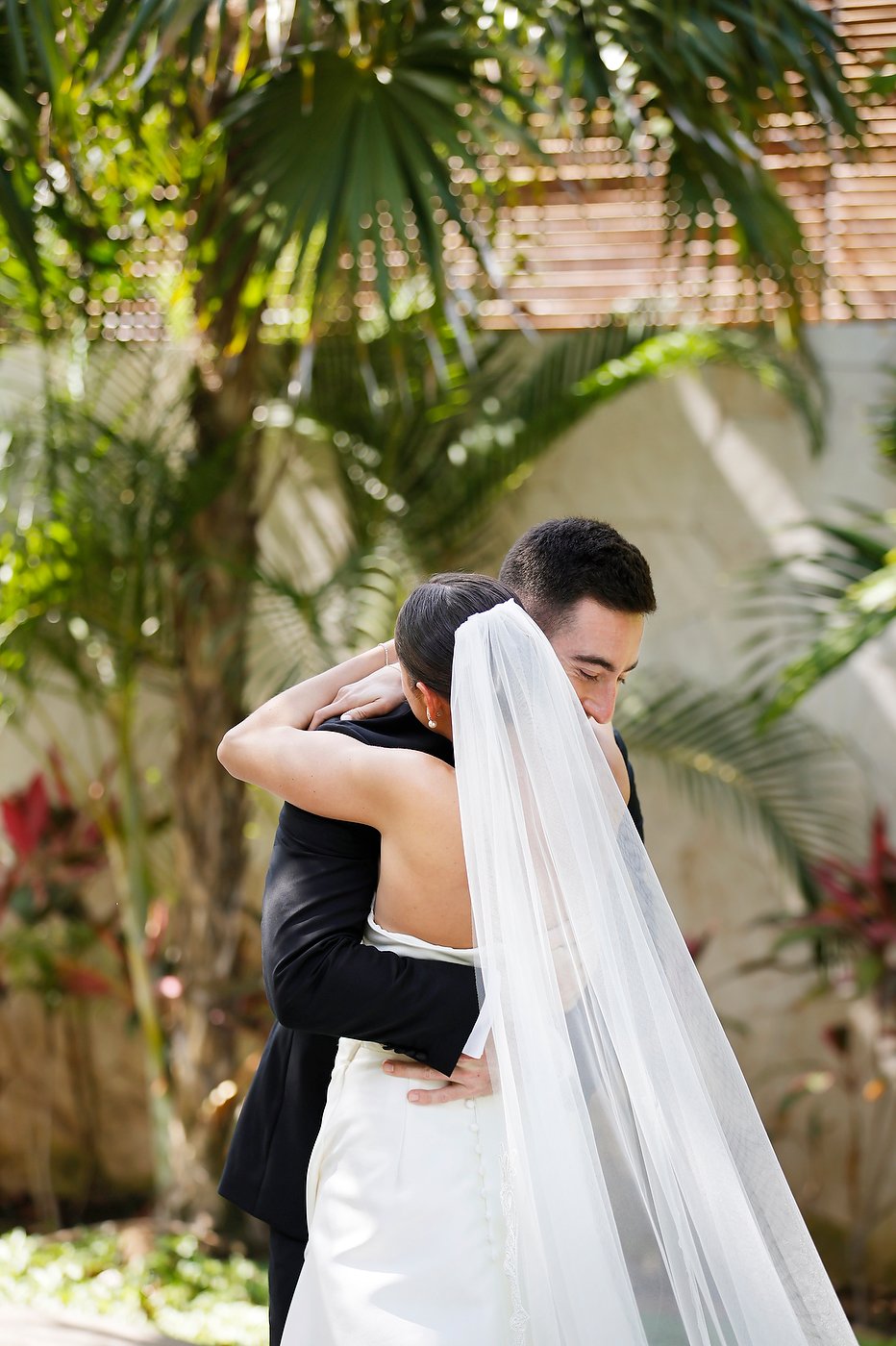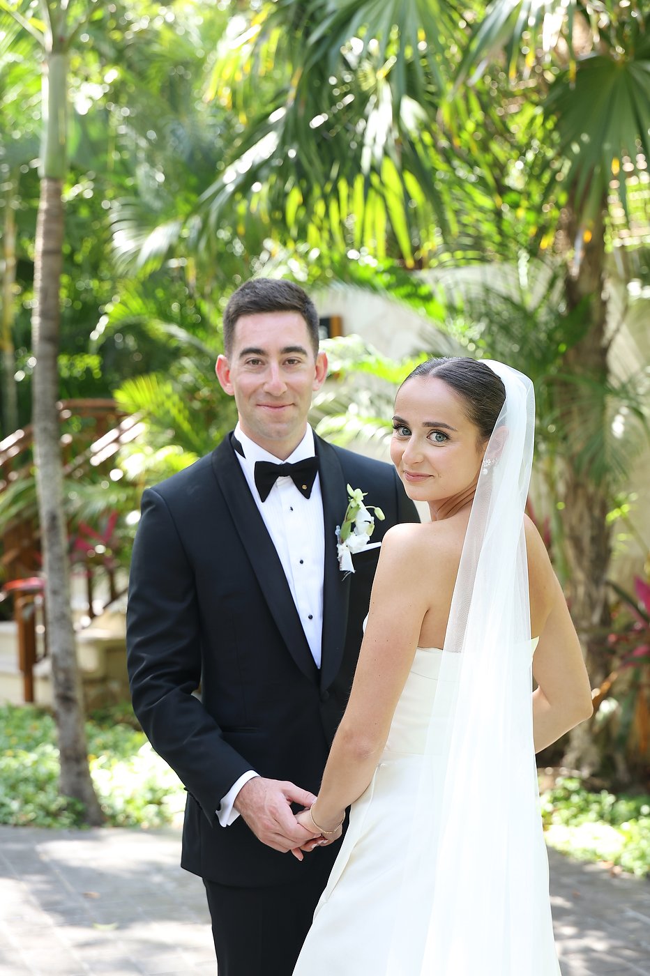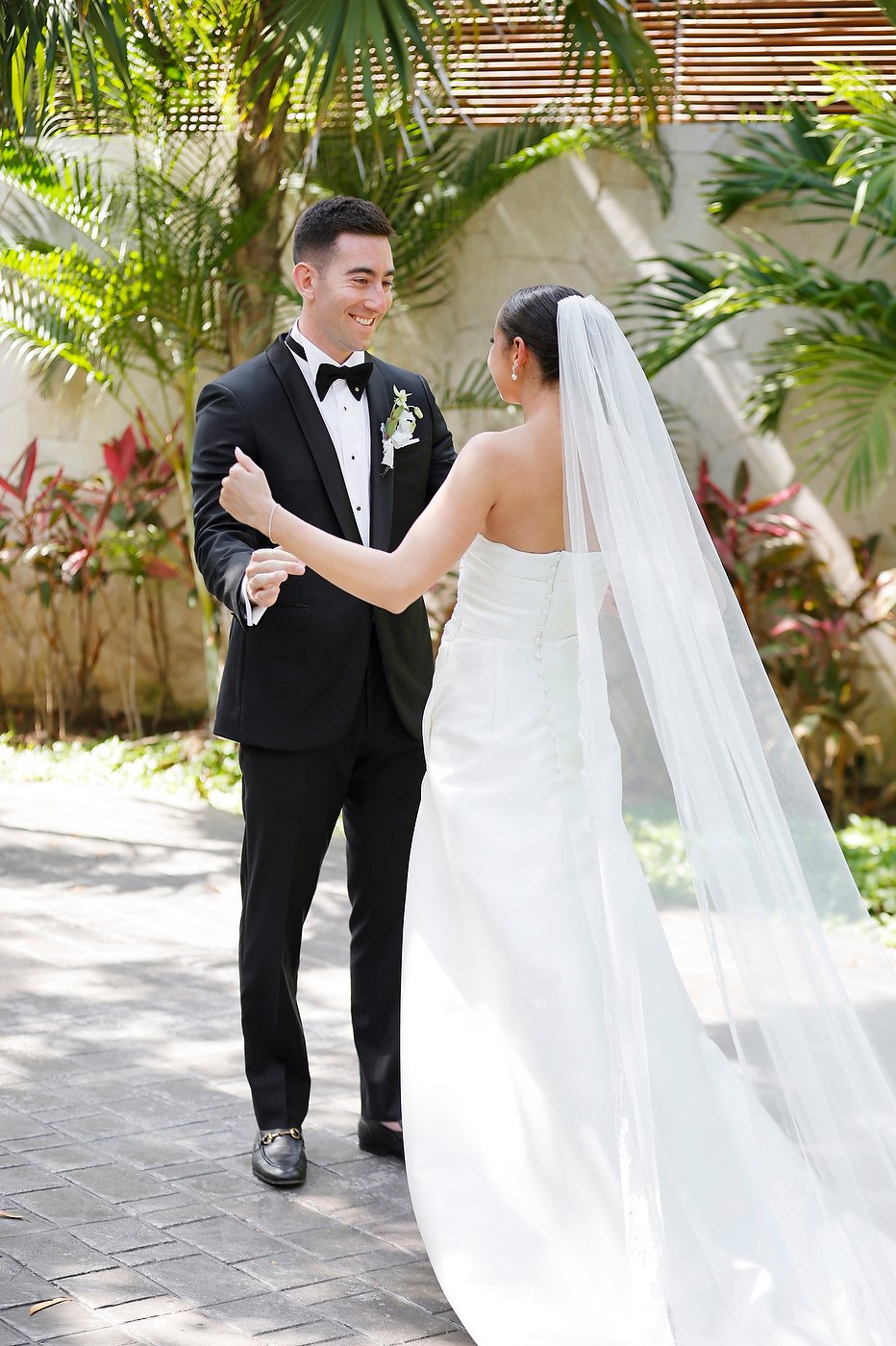 Once both were ready, we moved into one of the most touching moments of the day — the first look. Set within the lush pathways of Fairmont, surrounded by tropical greenery and the soft rustle of nature, Courtney and Rider saw each other for the first time that day. The emotion in their faces spoke louder than words. It was a quiet, intimate moment of pure connection — a beautiful pause before the joyful whirlwind to come.