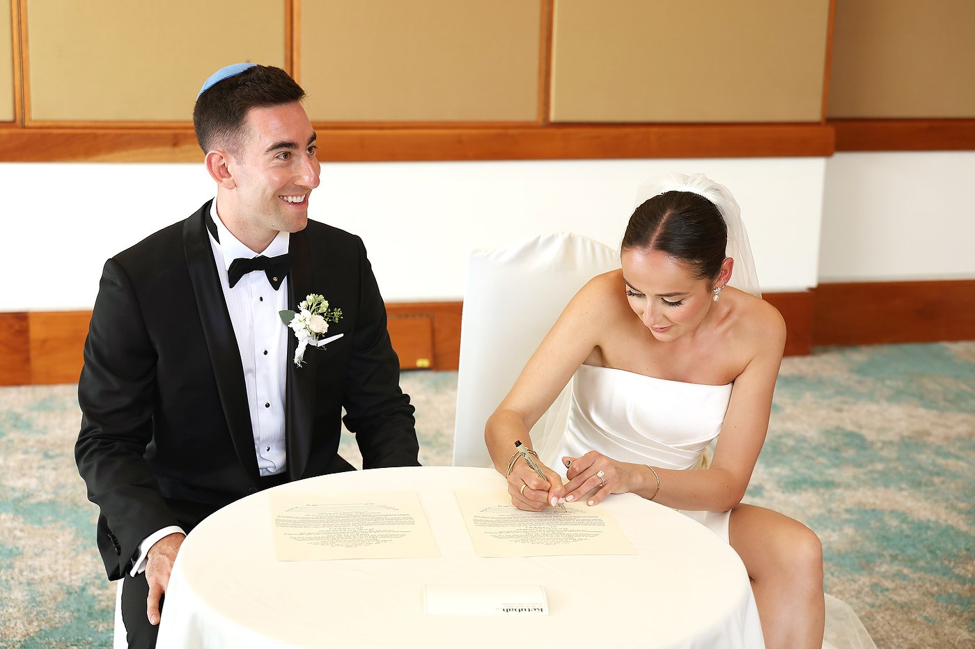 Afterward, the couple proceeded to the Ketubah signing, which took place in one of Fairmont’s elegant salons. This Jewish tradition added a deeply personal and spiritual dimension to the day. Surrounded by their loved ones, they signed the Ketubah with heartfelt smiles and tears, sealing their commitment in a way that honored their faith and heritage.