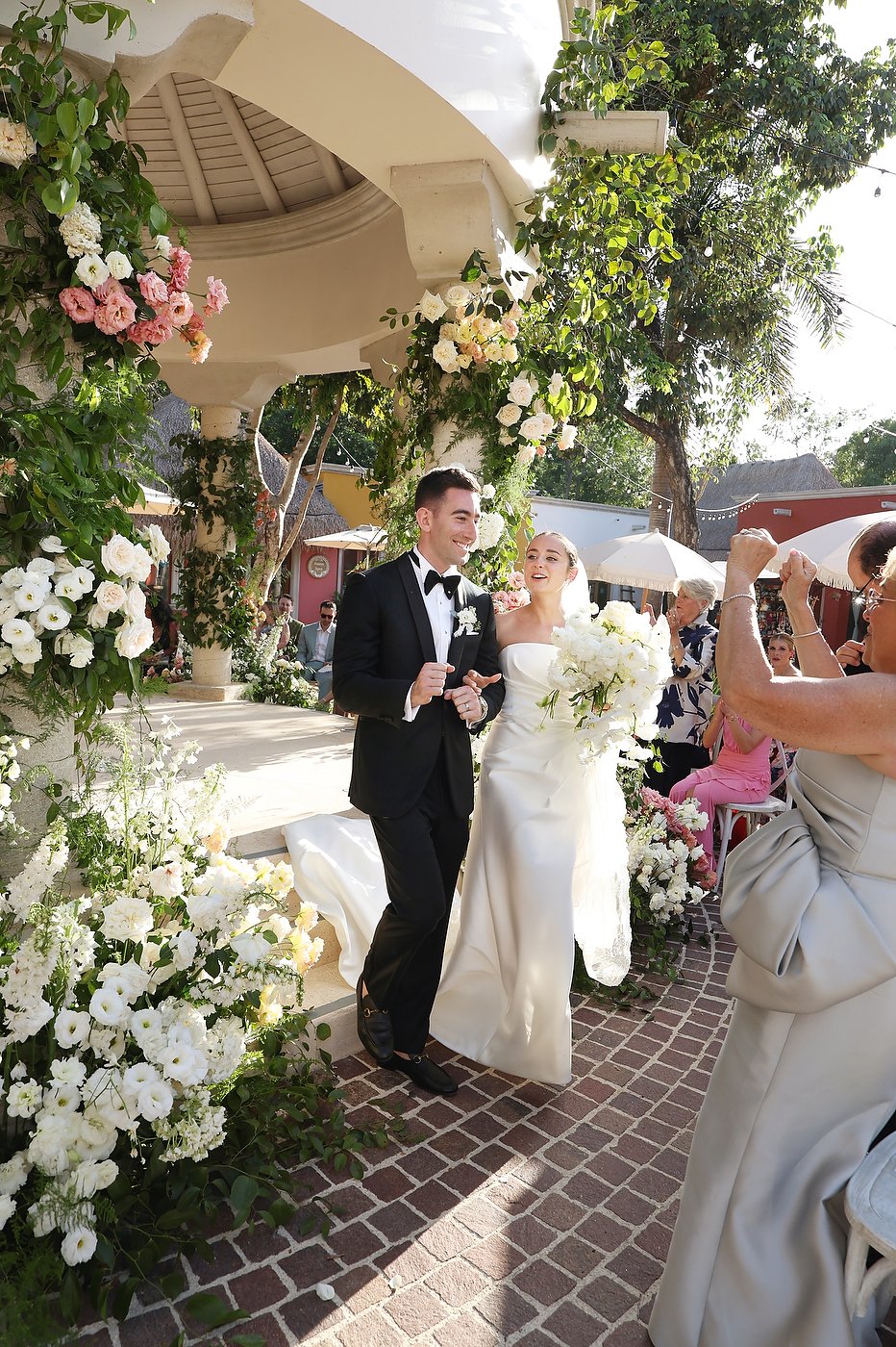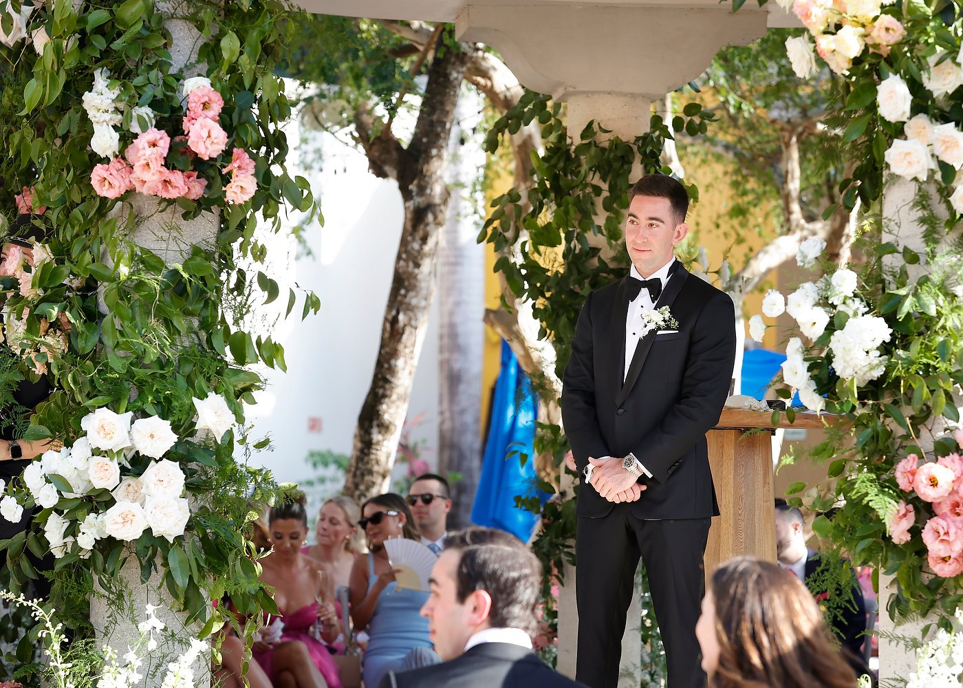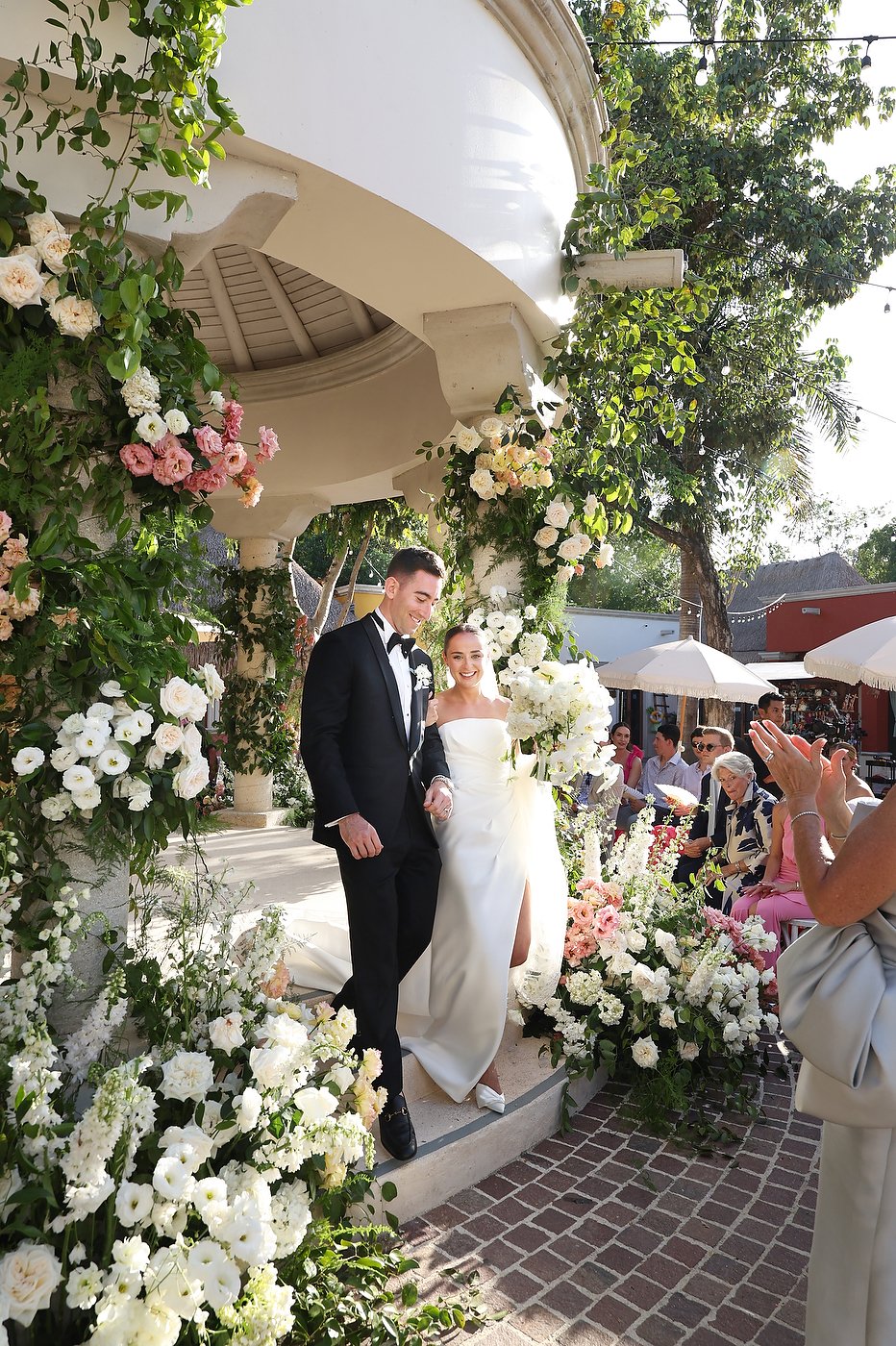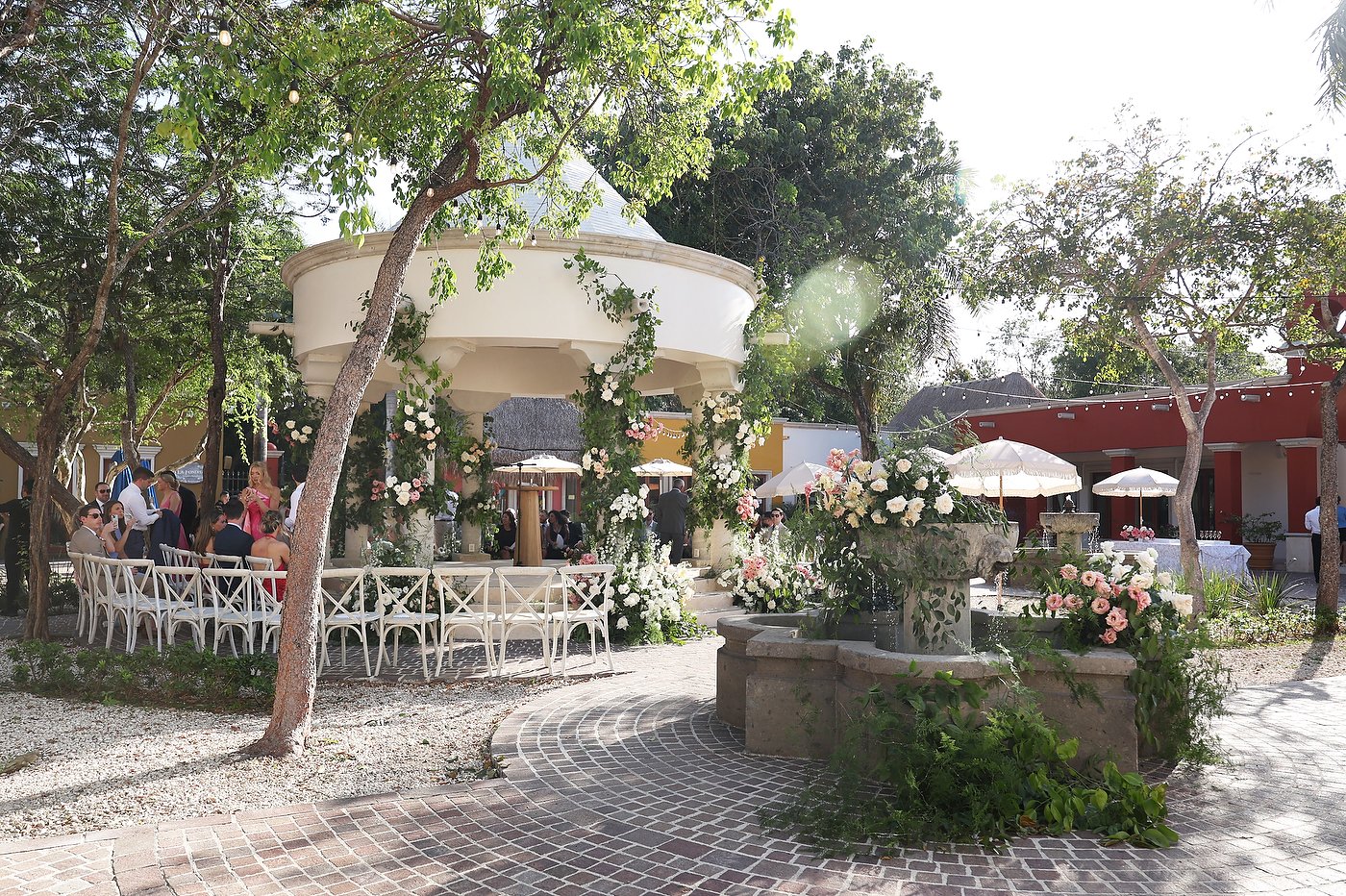 From there, we transitioned to El Pueblito, Mayakoba’s charming and colorful village square, where the ceremony took place. The setting could not have been more picturesque — the ceremony was held in the kiosk at the center of the garden, surrounded by vibrant flowers, lush greenery, and the warm hues of the Mexican architecture. The atmosphere was filled with emotion as Courtney walked down the aisle, radiant and serene, while Rider waited for her under the gazebo. Their vows were sincere and moving, and there wasn’t a dry eye in the audience. The love between them was palpable, and the setting only amplified the sense of warmth and togetherness that defined the entire day.