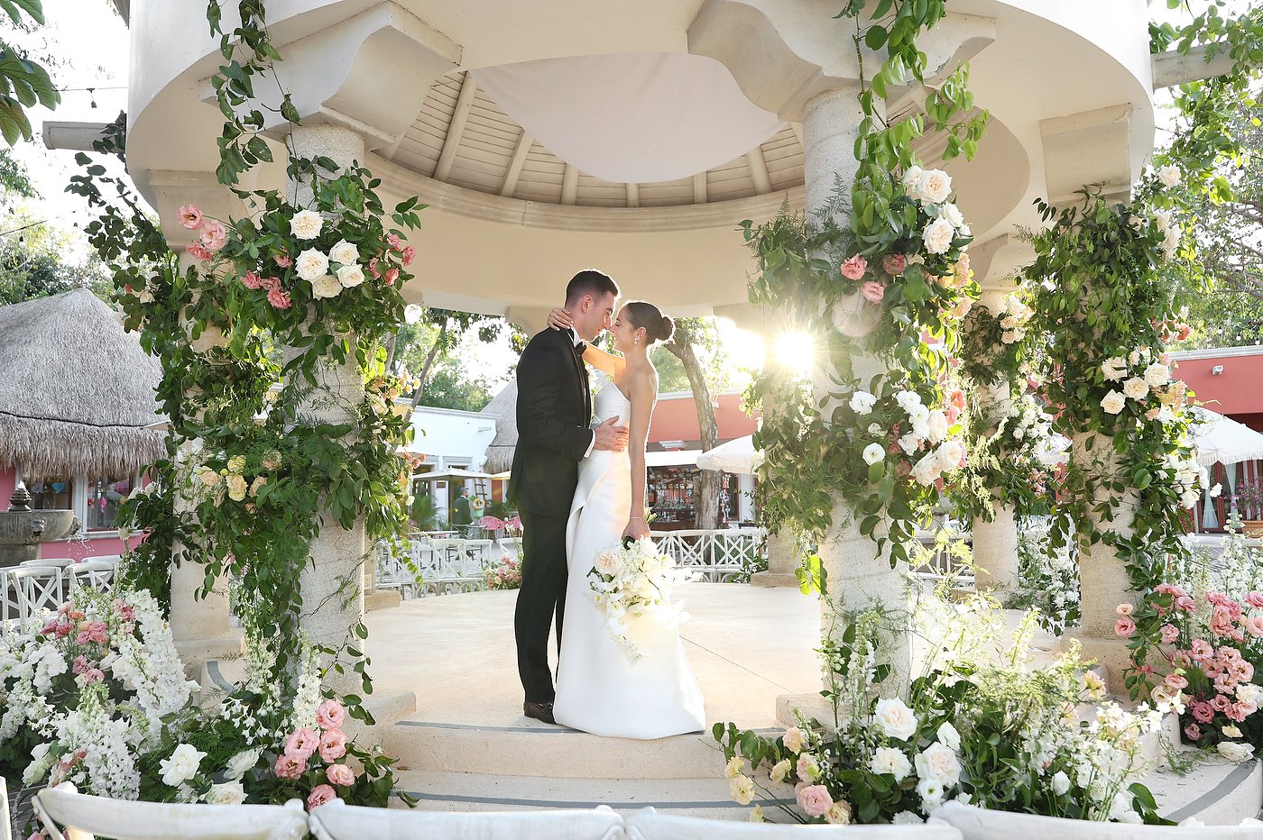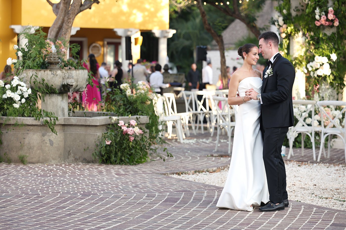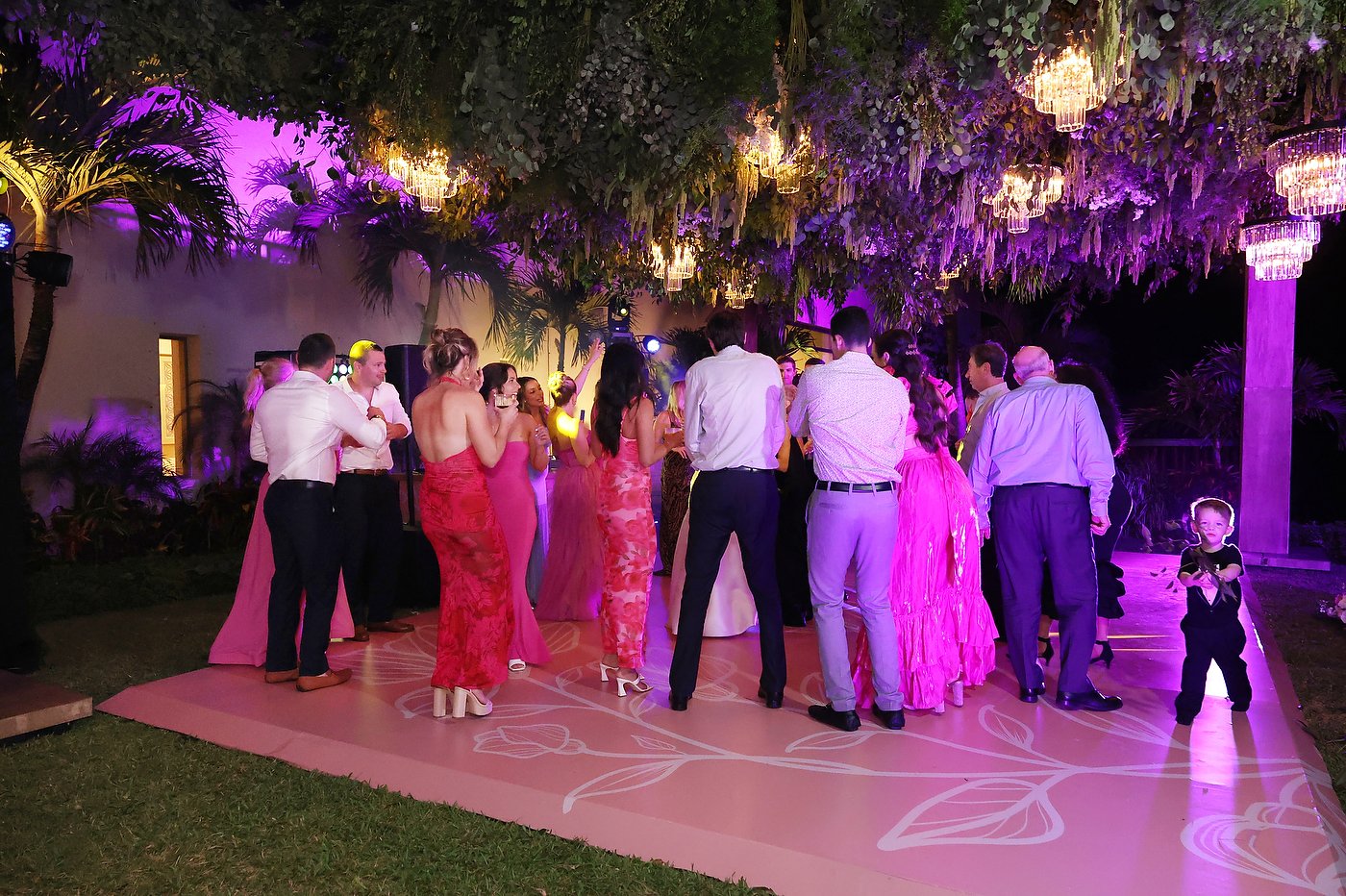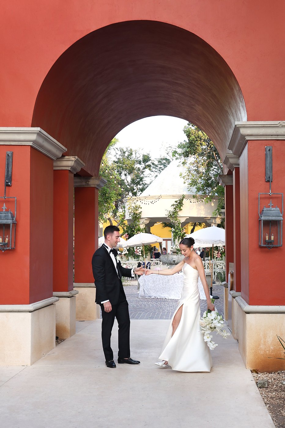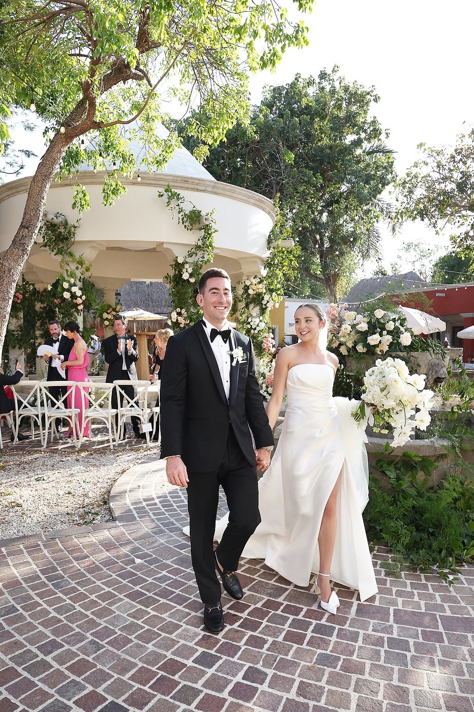 From there, we transitioned to El Pueblito, Mayakoba’s charming and colorful village square, where the ceremony took place. The setting could not have been more picturesque — the ceremony was held in the kiosk at the center of the garden, surrounded by vibrant flowers, lush greenery, and the warm hues of the Mexican architecture. The atmosphere was filled with emotion as Courtney walked down the aisle, radiant and serene, while Rider waited for her under the gazebo. Their vows were sincere and moving, and there wasn’t a dry eye in the audience. The love between them was palpable, and the setting only amplified the sense of warmth and togetherness that defined the entire day.