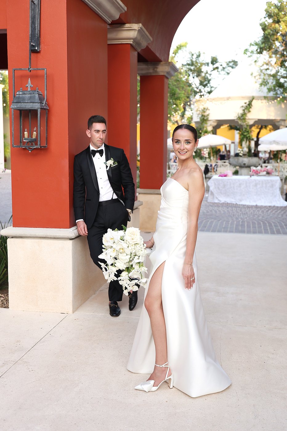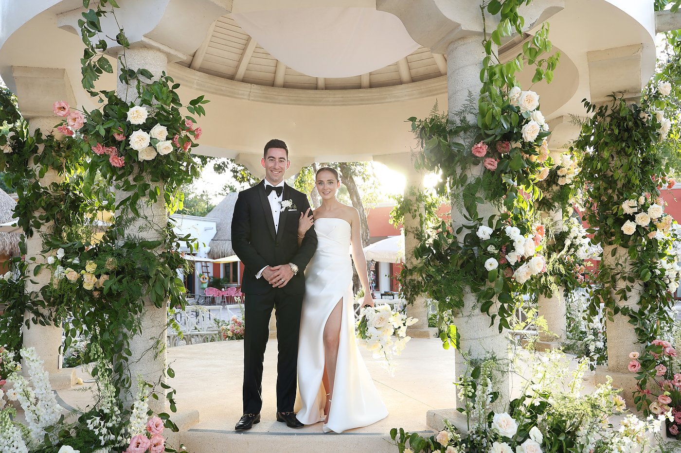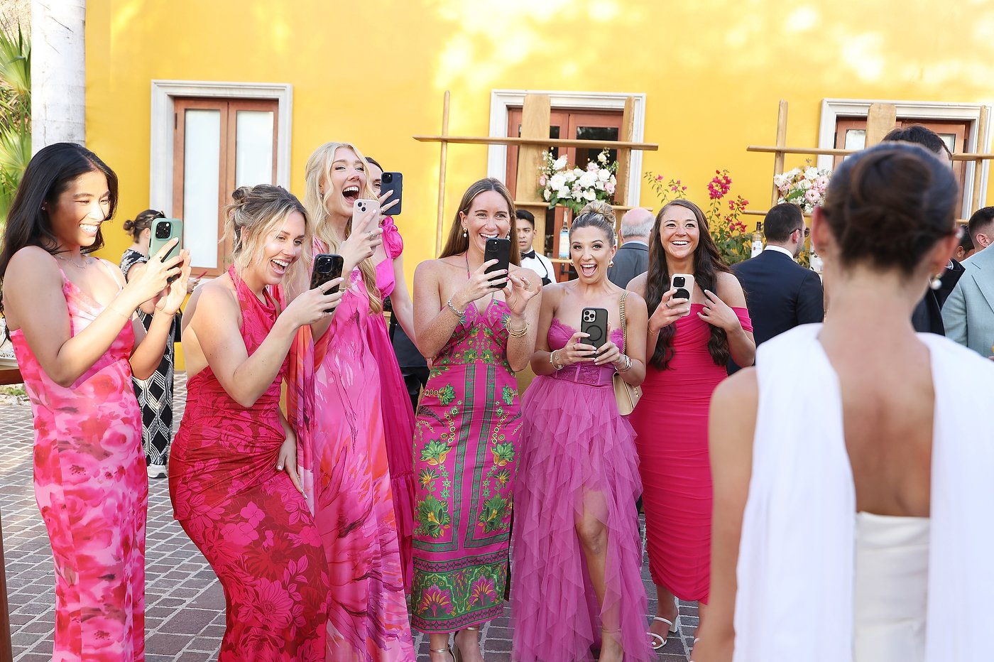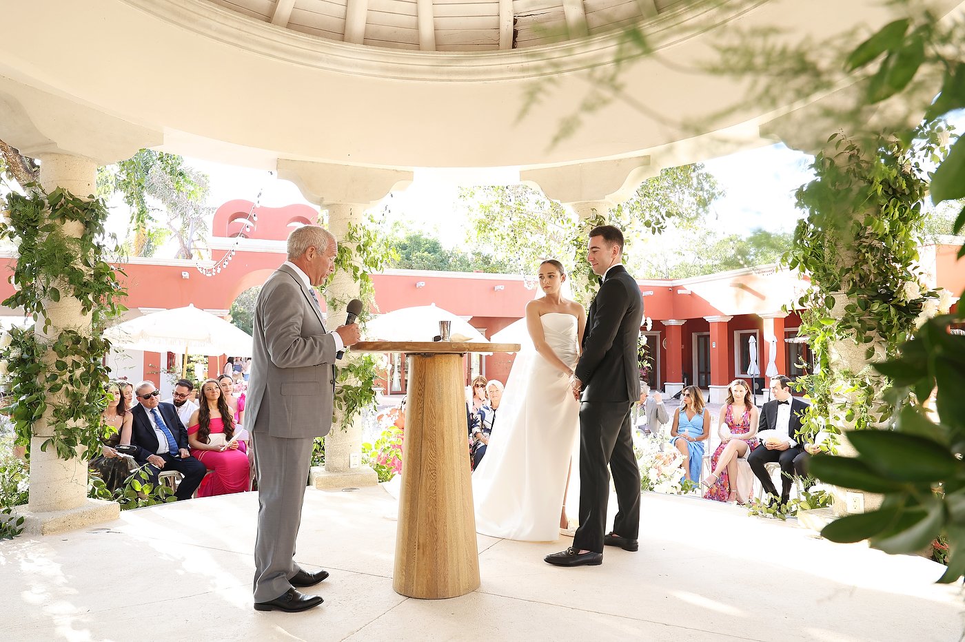 From there, we transitioned to El Pueblito, Mayakoba’s charming and colorful village square, where the ceremony took place. The setting could not have been more picturesque — the ceremony was held in the kiosk at the center of the garden, surrounded by vibrant flowers, lush greenery, and the warm hues of the Mexican architecture. The atmosphere was filled with emotion as Courtney walked down the aisle, radiant and serene, while Rider waited for her under the gazebo. Their vows were sincere and moving, and there wasn’t a dry eye in the audience. The love between them was palpable, and the setting only amplified the sense of warmth and togetherness that defined the entire day.