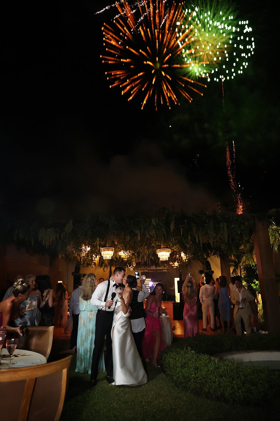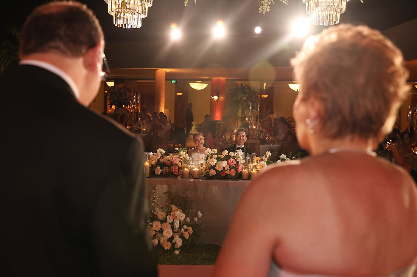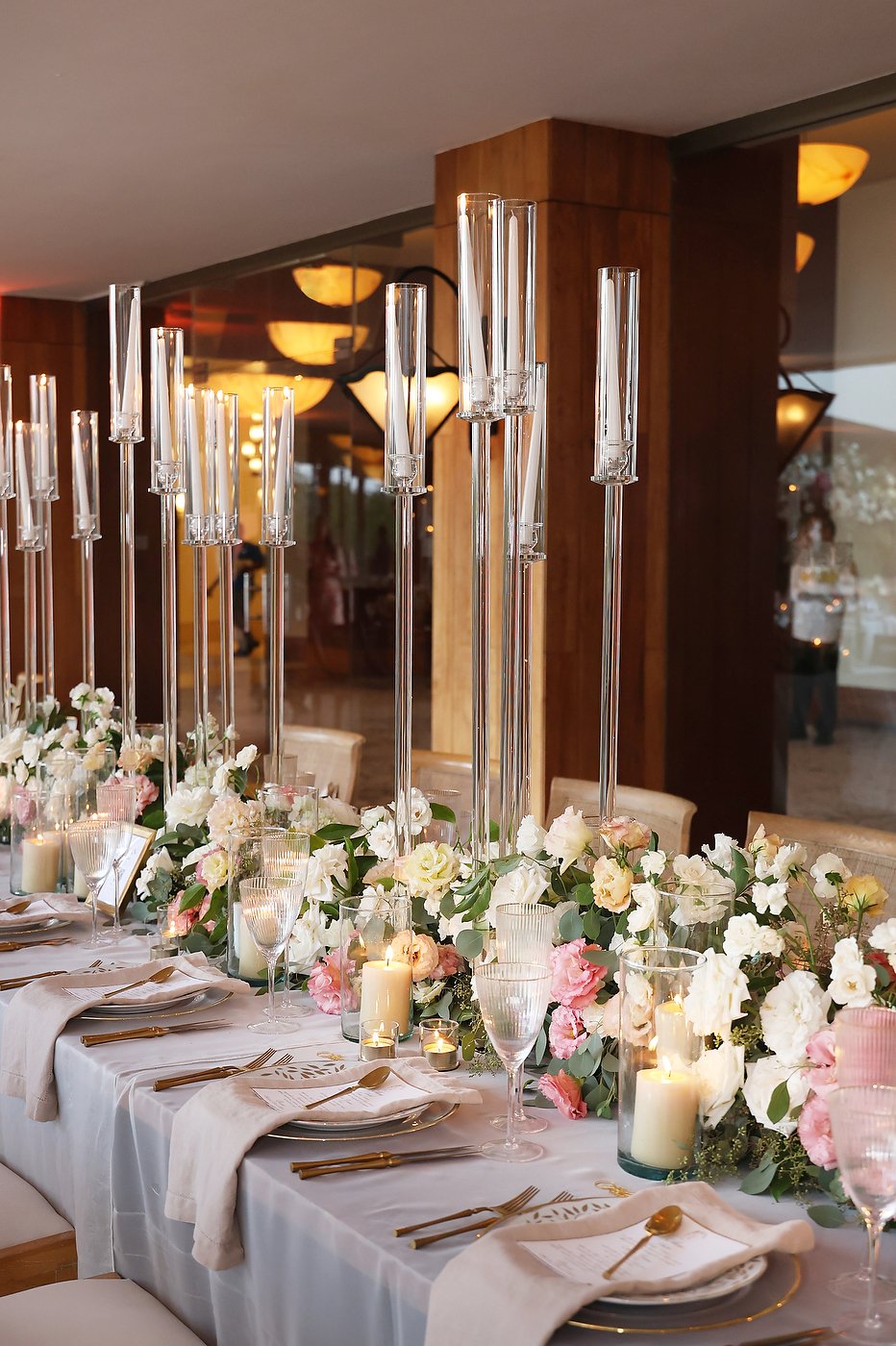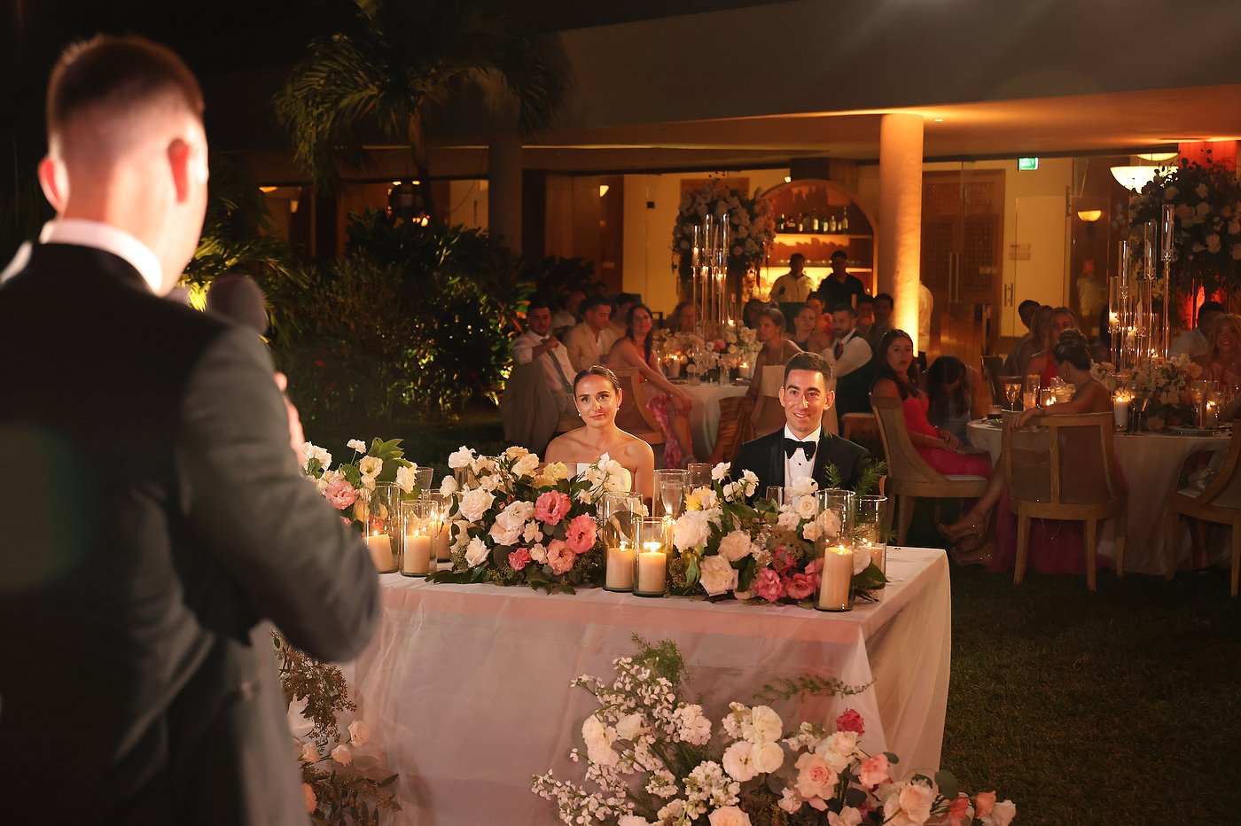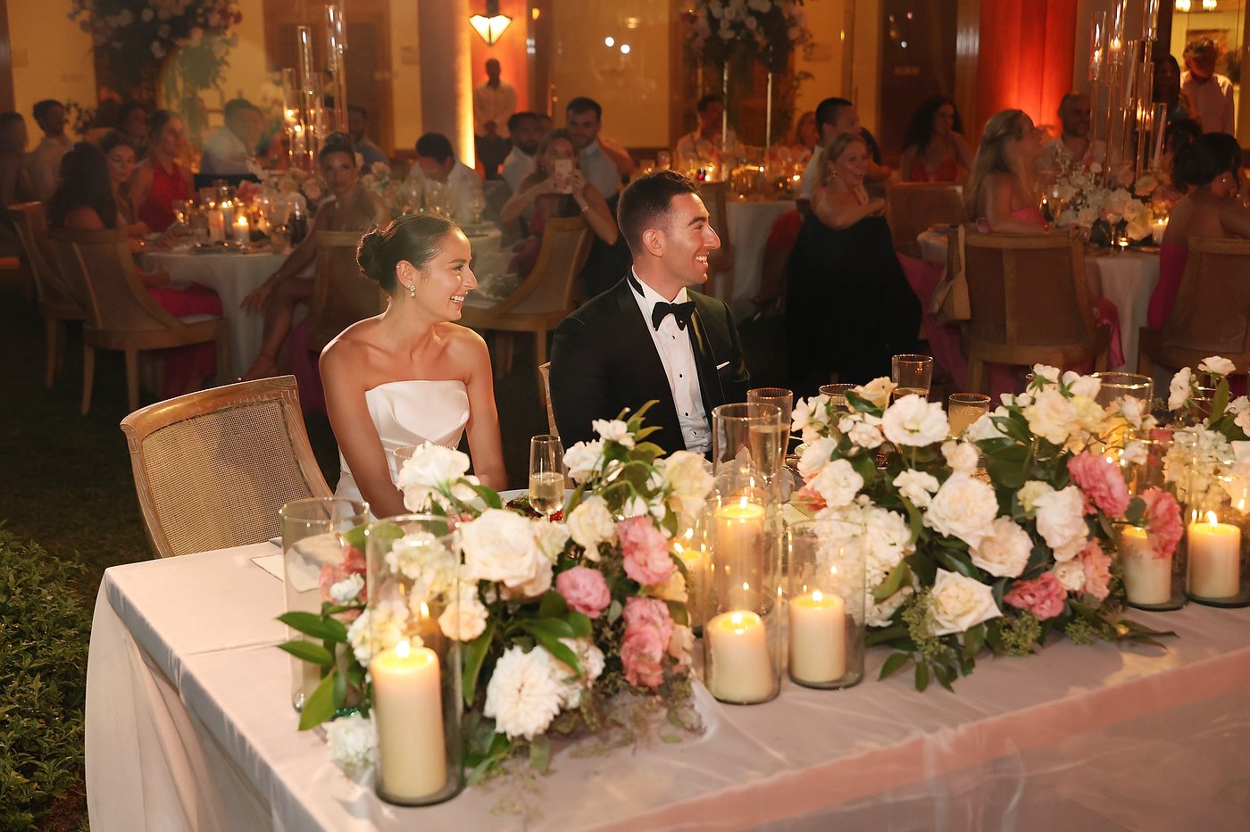 After the ceremony, we returned to Fairmont Mayakoba for the reception, held in the elegant Terraza Lawn area. The space was beautifully transformed by Canteiro Weddings, who handled both the planning and the floral design. Every detail was stunning — from the soft, romantic candlelight to the sophisticated table arrangements adorned with delicate flowers and greenery. The décor perfectly reflected Courtney and Rider’s refined taste and the relaxed luxury of the Riviera Maya.